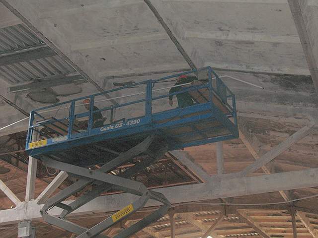 Монтаж пожарного трубопровода производится с ножничного подъемника